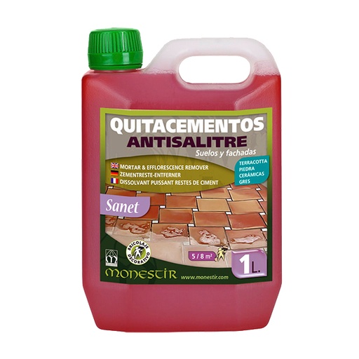 Se aplica diluyéndolo con agua según el grado de suciedad del pavimento. Por regla general, se diluye una parte de Sanet con 1 a 5 agua y para materiales sensibles a los ácidos como Baldosín Hidráulico y derivados del cemento o para eliminar velos blancos, diluiremos una parte de Sanet con 10 de agua.
